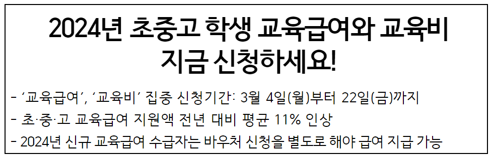 2024년 3월 4일(월)부터 3월 33일(금)까지 교육급여 교육비 지원 집중 신청기간입니다. 이 기간을 놓치더라도 연중 신청 하실 수 있지만 학기 초부터 지원을 원하는 경우 집중신청기간인 3월에 신청하시는 게 좋습니다.
