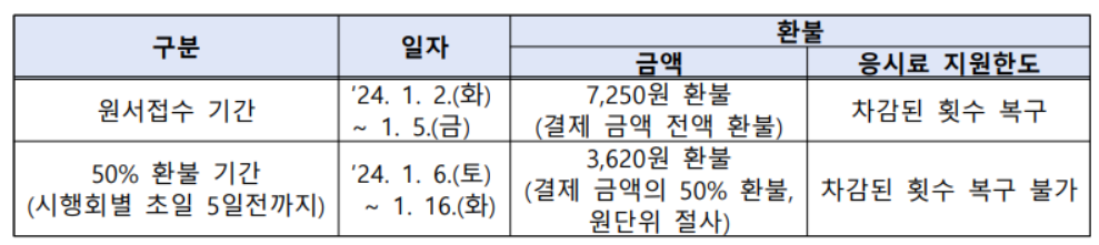 4. 환불은 실제 결제 금액 기준으로 진행(50% 환불 시 10원 미만 금액 절사)