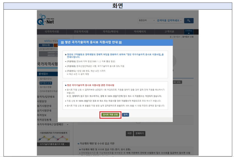5. 응시료 지원사업 안내 유의사항 확인 후 지원신청 클릭