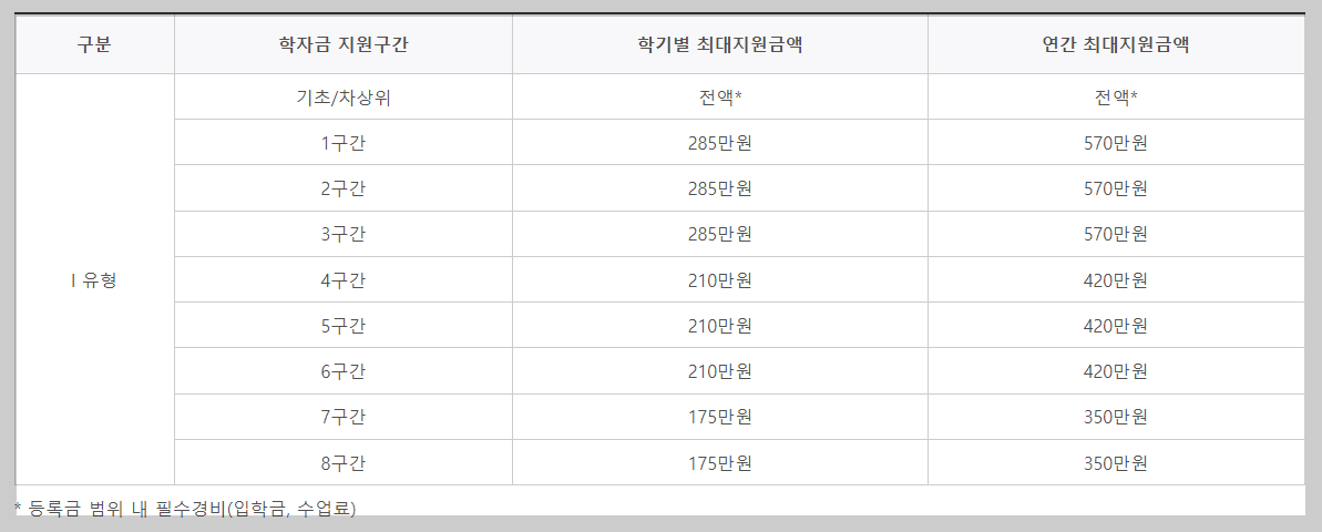 지원금액은 학자금 지원구간별로 해당 학기 등록금 필수경비(입학금, 수업료)를 초과하지 않는 범위내에서 차등 지원됩니다.
